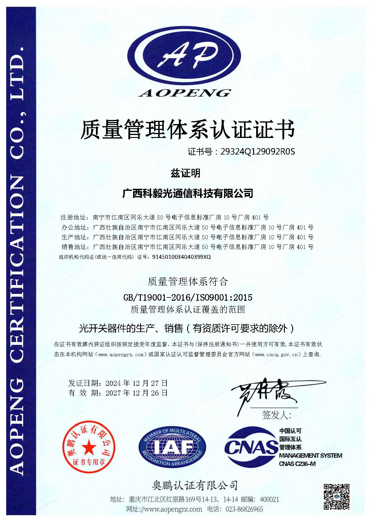 質(zhì)量管理體系認(rèn)證證書